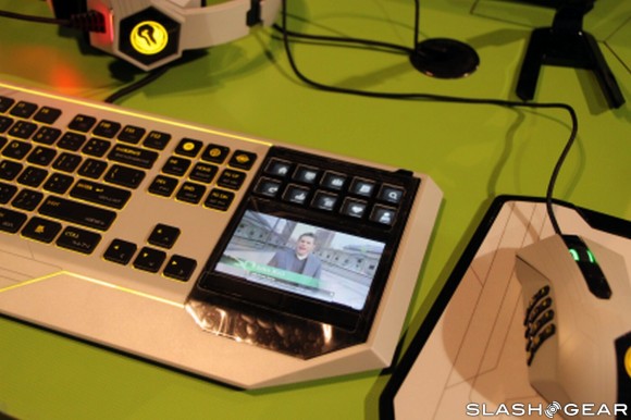 The video touchscreen hangs out on the right side of the keyboard, where the number pad would normally be. The low-resolution screen is a laptop-style touchpad when not in active use, with a series of ten buttons on top with tiny OLEDs embedded in them. The buttons change depending upon which app you’re using on the keyboard at the time – for example, in the browser or YouTube app, you get the basic back/forward/reload navigation buttons. The profiles can be changed for each game or application.