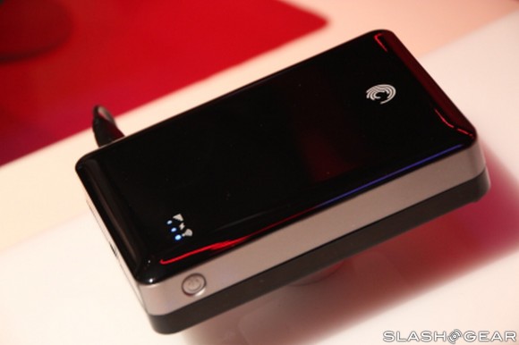 The 500GB conventional drive acts as a standard shared drive/file server for up to three active users, just like Seagate’s similar WiFi-only FreeAgent product available today. It comes with a battery as well, so untethered access should be god for a few hours, though excessive use of the hard drive will lower this. The unit is being developed for corporate customers at the moment, with consumers coming some time after initial release.